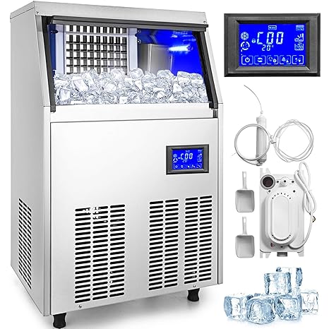 VEVOR 110V Commercial ice Maker 120-130LBS/24H with 33LBS Bin and Electric Water Drain Pump, Clear Cube, Stainless Steel Construction, Auto Operation, Include Water Filter 2 Scoops and Connection Hose. The 7*18 ice tray produces 126 clear cubes in just 8-15 minutes, making it perfect for mixed drinks and bottles with small openings. 80 - 90 lb. Cherishing. 5. 4. hOmeLabs Freestanding Commercial Ice Maker Machine - Makes 99 Pounds Ice in 24 hrs with 29 Pounds Storage Capacity - Ideal for Restaurants, Bars, Homes and Offices - Includes Scoop and Connection Hose.
