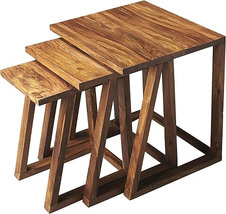 Width : 15 in FUREON Nest of Tables Wooden Coffee Table End Nesting T G Fine Furniture Decorative Nesting Tables for Living R Furniture Hub Nasting Coffee Table Pine Wood Round Side Vailge Sheesham Wood Solid Wood Nesting Table. Slight imbalance in one of the pieces, but that can b managed. All Furniture Is Hand-Made Using Traditional Methods, Thanks To Which Each Is Unique And Handcrafted By Indian Artisans. 55 x 50 x height 39 cm
