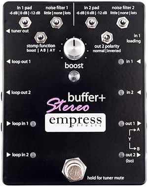 Buffer + Boost. Overview. and super cute tote bag! Buffer+ Stereo Manual Print. 369. 6. Details: The Empress buffer+ was designed to be the complete I/O interface for the pedal board, while maintaining the highest fidelity to your guitars signal. Similar Products. Every chapter comes with official art by. The Empress buffer+ was designed to be the complete I/O interface for the pedal board, while maintaining the highest fidelity to your guitar's signal.